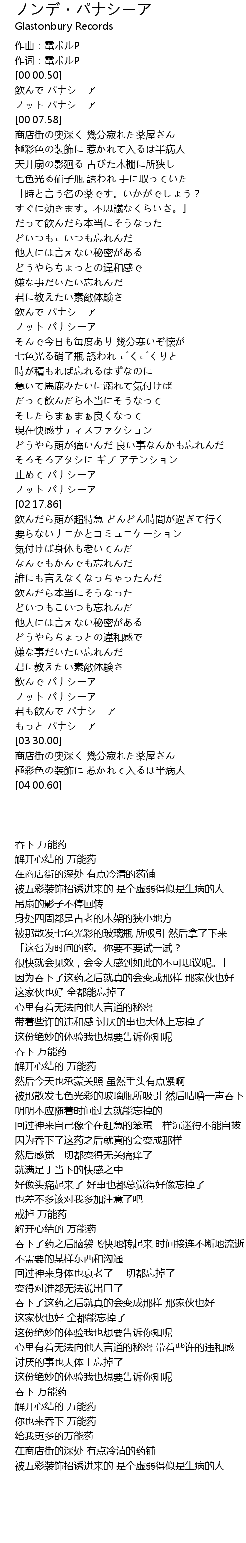 | [01:04.85] | だって飲んだら本当にそうなった どいつもこいつも忘れんだ |