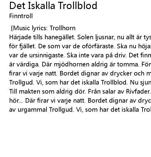 | The Icecold Trollblood Music lyrics: Trollhorn Striden mot m nniskan. H rjade tills haneg llet. Solen ljusnar, nu allt r tyst. Blodet rinner ned f r fj llet. De som var de of rf raste. Ska nu h jas till eviga liv. De som var de ursinnigaste. Ska inte vara p driv. Det finns ett efterliv. F r de som r v rdiga. D r mj dhornen aldrig r tomma. F r de som r modiga. D r firar vi varje natt. Bordet dignar av drycker och matt. Under gon av urgammal Trollgud. Vi, som har det iskalla Trollblod. Nu sjunger vi v rt dryckeskv de. Till makten som aldrig d r. Fr n salar av Rivfader. Skallar ljudet som alla h r... D r firar vi varje natt. Bordet dignar av drycker och matt. Under gon av urgammal Trollgud. Vi, som har det iskalla Trollblod. |