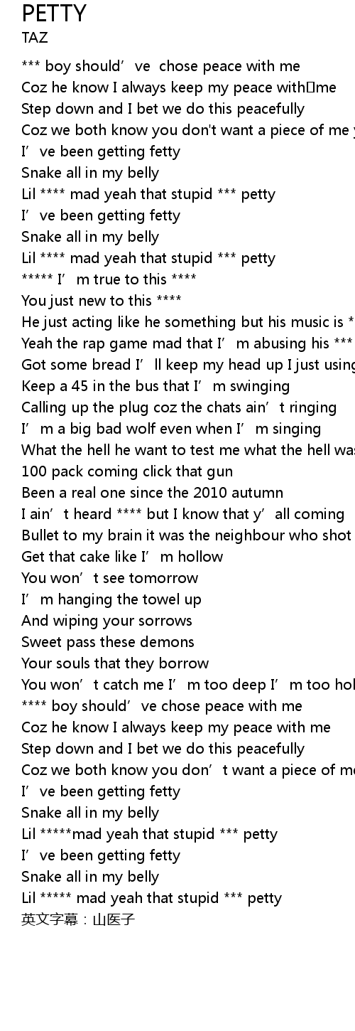 | [00:38.490] | Lil **** mad yeah that stupid *** petty |