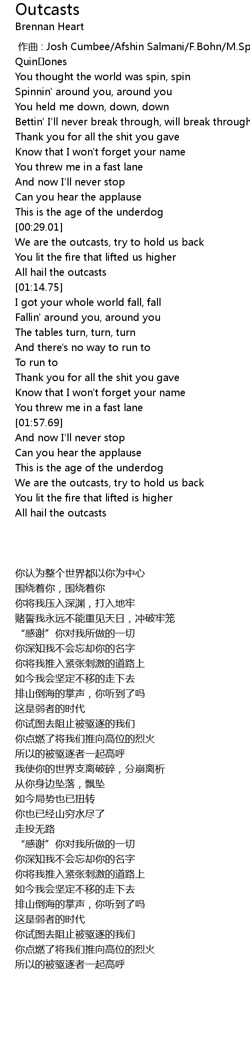 | [00:29.60] | We are the outcasts, try to hold us back |