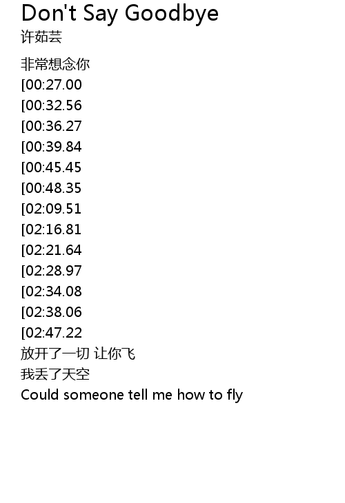 | [03:26.60][02:09.51][00:52.67] | Tell me You don' t wanna say goodbye goodbye |