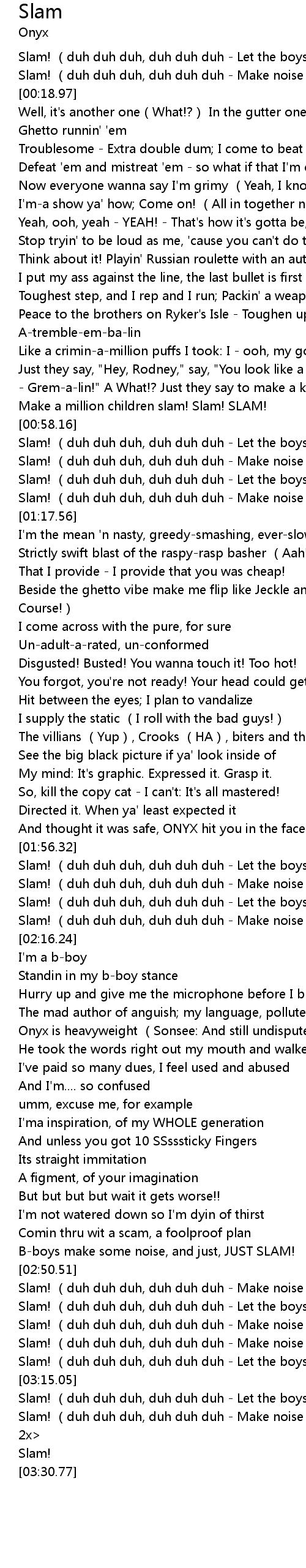 | [03:24.90] | Slam! duh duh duh, duh duh duh Make noise bboys! repeat both 2x |