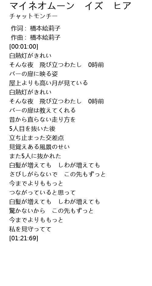 | [00:10:26] | そんな夜 飛び立つわたし 0時前 |