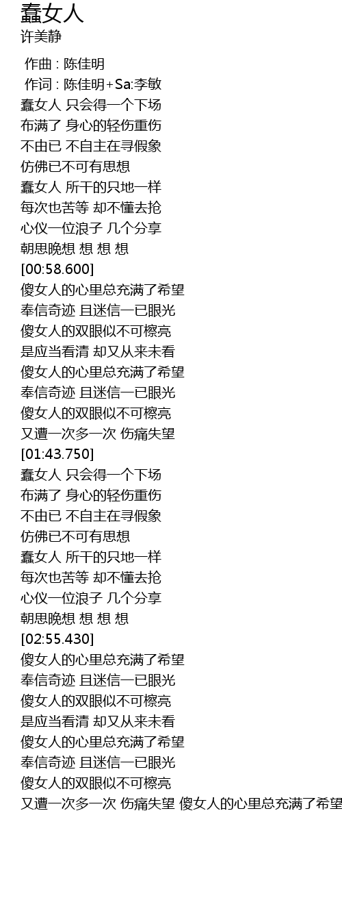 | [00:59.150] | shǎ nǚ rén de xīn lǐ zǒng chōng mǎn le xī wàng |