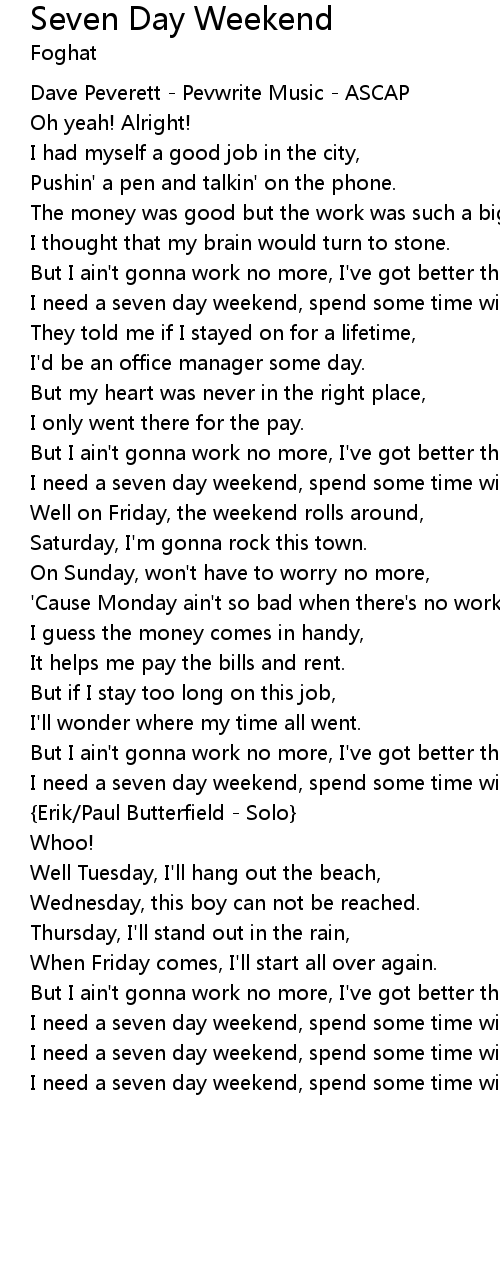 I need a seven day weekend, spend some time with you, mmm hmm. |