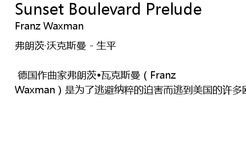 | 德国作曲家弗朗茨•瓦克斯曼(Franz Waxman)是为了逃避纳粹的迫害而逃到美国的许多欧洲著名作曲家中的一位,他的电影作品令人耳熟能详,比如《蝴蝶梦》、《毁灭者的新娘》、《日落大道》。像其他好莱坞的同辈作曲家科恩戈尔德、策姆林斯基和舍恩伯格一样,瓦克斯曼是一位天才的、受过严格专业训练的作曲家,在当时很受尊敬。 |