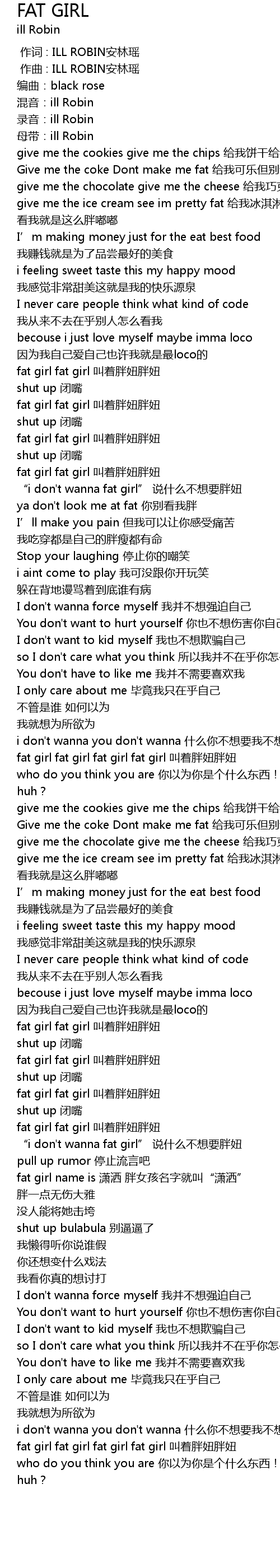 | [01:28.904] | fat girl fat girl fat girl fat girl jiào zhe pàng niū pàng niū |