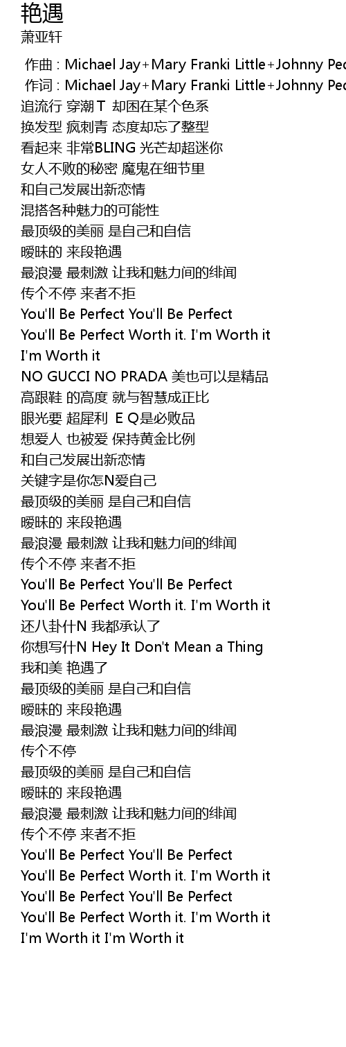 | [00:53.120] | You' ll Be Perfect Worth it. I' m Worth it |