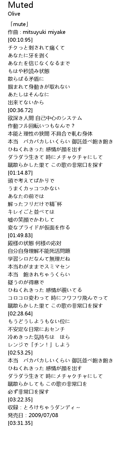 | [00:43.83] | 本能と理性の狭間 不具合で軋む身体 |