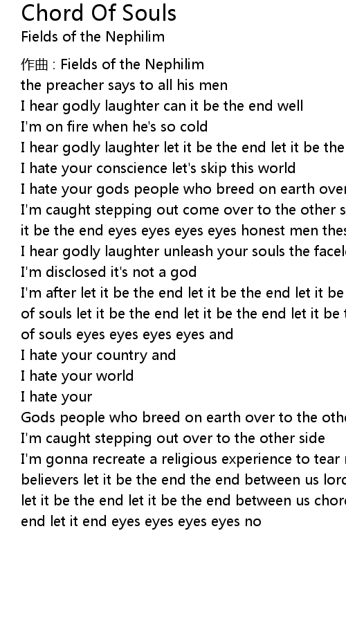 | I' m gonna recreate a religious experience to tear my ing heart out the end believers let it be the end the end between us lord of souls the end believers let it be the end let it be the end between us chord of souls let it end let it end let it end eyes eyes eyes eyes no |