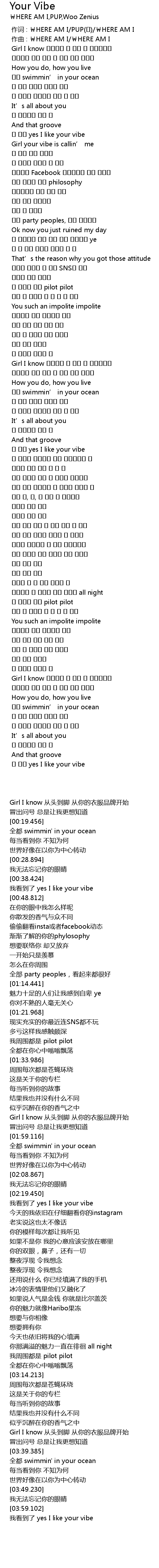 | [02:23.443] | 난 봤어 yes I like your vibe |