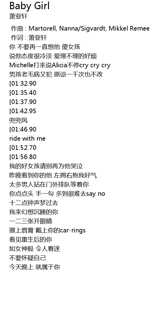 | [01:00.20][01:46.90][02:34.25][02:53.40][03:12.70] | My baby girl lái tiào gè wǔ just ride with me |