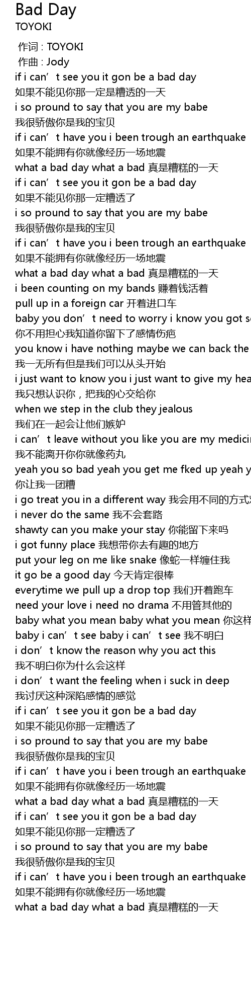| [01:55.179] | if i can' t see you it gon be a bad day rú guǒ bù néng jiàn nǐ nà yí dìng zāo tòu le |