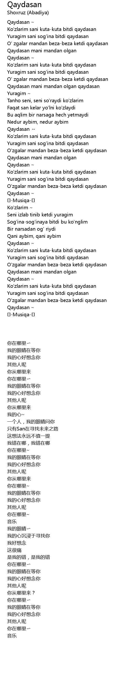 | [00:34.72] | O' zgalar mandan beza-beza ketdi qaydasan |