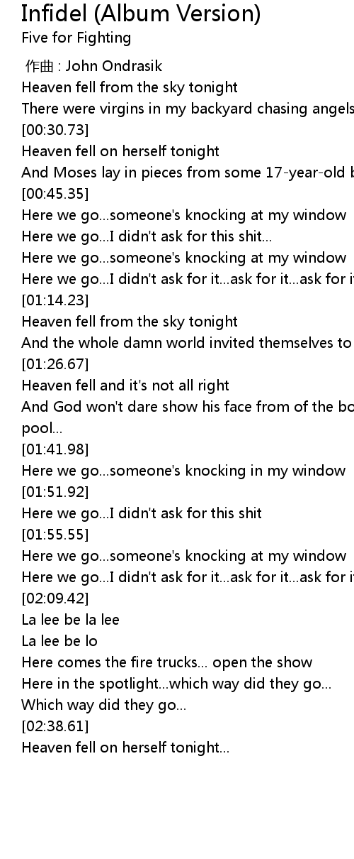 | [00:24.91] | There were virgins in my backyard chasing angels with fire sticks... |