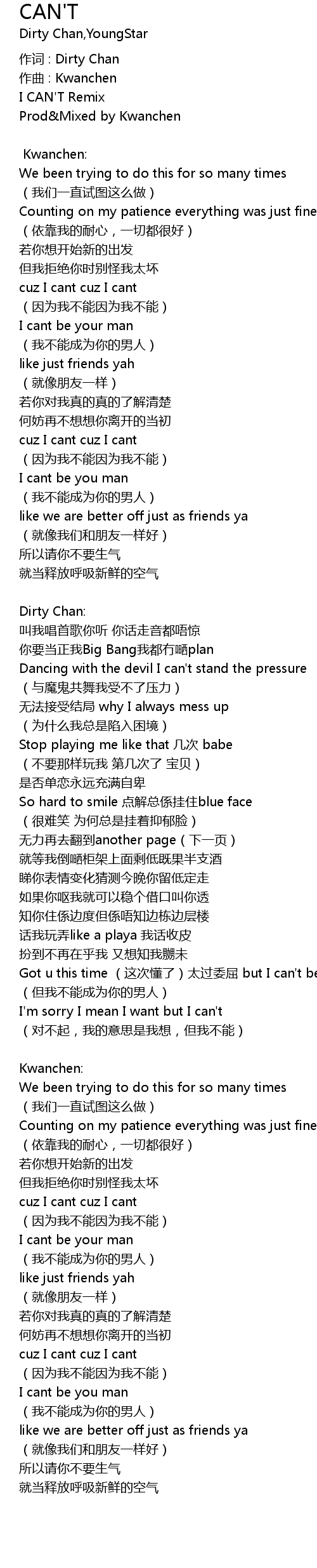 | Got u this time (这次懂了)太过委屈 but I can't be ur man | |