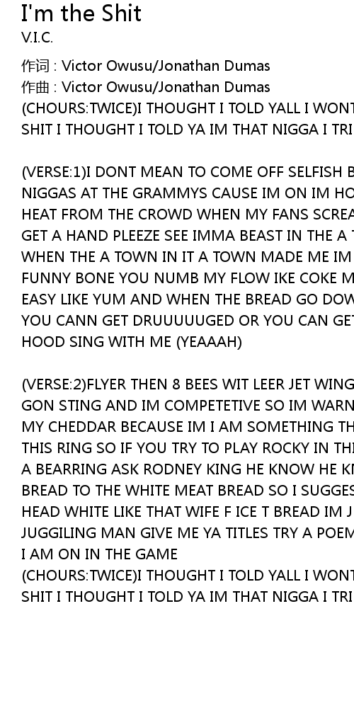 | VERSE: 1 I DONT MEAN TO COME OFF SELFISH BUT MAN PLEEZE I SUPPORTED ALL YALL NIGGAS AT THE GRAMMYS CAUSE IM ON IM HOT PLEASE STAND ME I KNOW YOU FEEL THE HEAT FROM THE CROWD WHEN MY FANS SCREAM NOW EVERBODY STAND PLEEZE OVATION CAN I GET A HAND PLEEZE SEE IMMA BEAST IN THE A TOWN PHILLY YOU KNOW HOW IT GO DOWN WHEN THE A TOWN IN IT A TOWN MADE ME IM STUPID IM DUMB MY FLOW SO SILLY ILL FUNNY BONE YOU NUMB MY FLOW IKE COKE MY BEAT LIKE RUM THE HOOD MAKE IT GO DOWN EASY LIKE YUM AND WHEN THE BREAD GO DOWN EASY LIKE RUM THAT MEAN IM IN YO SYSTEM YOU CANN GET DRUUUUUGED OR YOU CAN GET SILLY AND IF YOU TRYNA MAKE IT OUT THE HOOD SING WITH ME YEAAAH | |