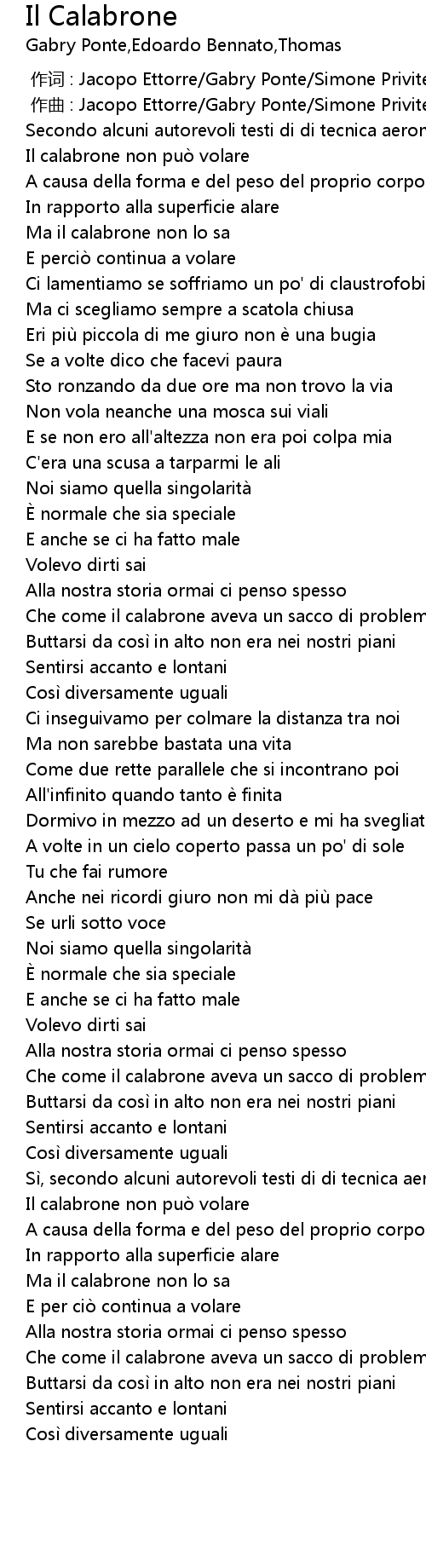 | [02:57.386] | Che come il calabrone aveva un sacco di problemi ma volava lo stesso |