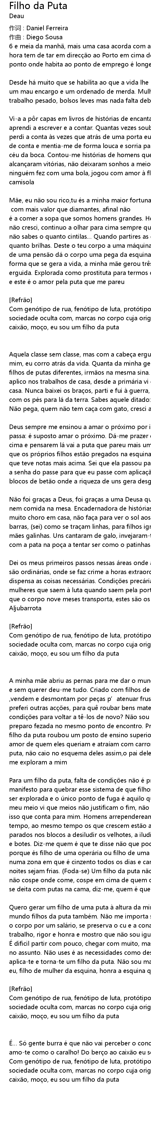 | Mãe, eu não sou rico,tu és a minha maior fortuna, rainha de bata preta e cola entranhada nas unhas. Princesa com [?] com mais valor que diamantes, afinal não é a comer a sopa que somos homens grandes. Hoje sou maior que tu, mas sinto que não cresci, continuo a olhar para cima sempre que preciso de ti. Acredita mãe, não sabes o quanto cintilas… Quando partires as estrelas descem para ver o quanto brilhas. Deste o teu corpo a uma máquina dentro de uma oficina, dentro de uma pensão dá o corpo uma pega da esquina. Pessoas que ganham a vida da forma que se gera a vida, a minha mãe gerou três filhos sempre com a cabeça erguida. Explorada como prostituta para termos o que nos deu, sou filho da puta e este é o amor pela puta que me pareu | |