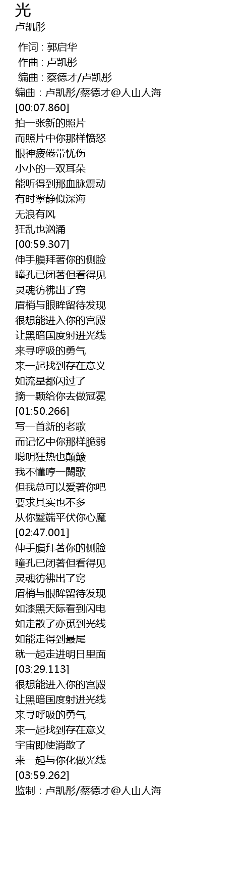 | [00:02.952] | 编曲:卢凯彤/蔡德才@人山人海 |