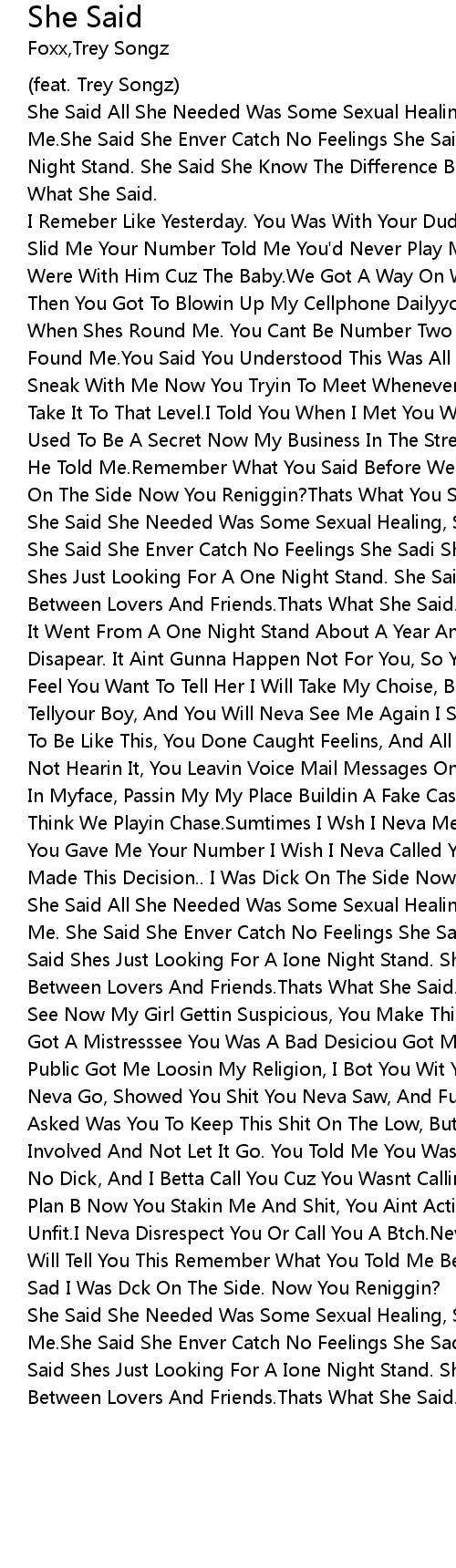 She Said All She Needed Was Some Sexual Healing, She Said Thats Why She Called Me. She Said She Enver Catch No Feelings She Sadi She Just Wants A Plan B. She Said Shes Just Looking For A Ione Night Stand. She Said She Know The Difference Between Lovers And Friends.Thats What She Said. |