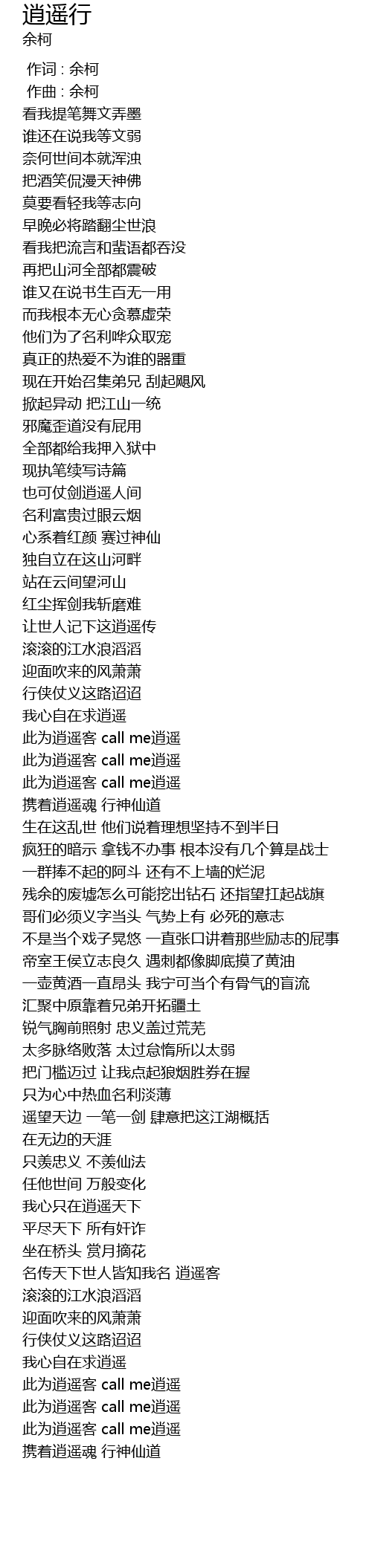| [01:18.985] | cǐ wèi xiāo yáo kè call me xiāo yáo |