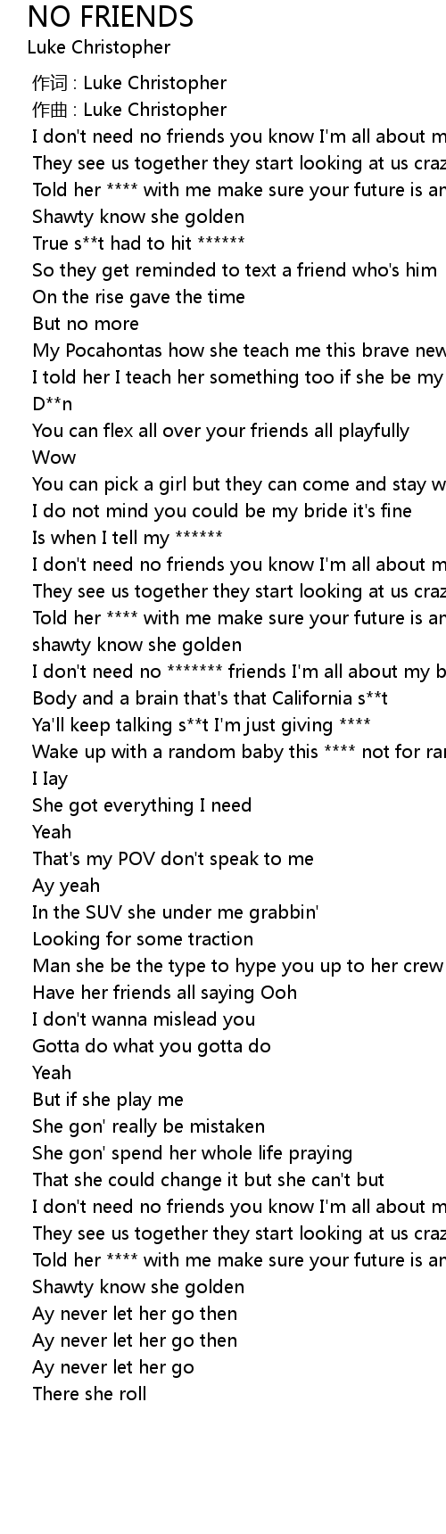 | [01:05.064] | I don't need no ******* friends I'm all about my bae |