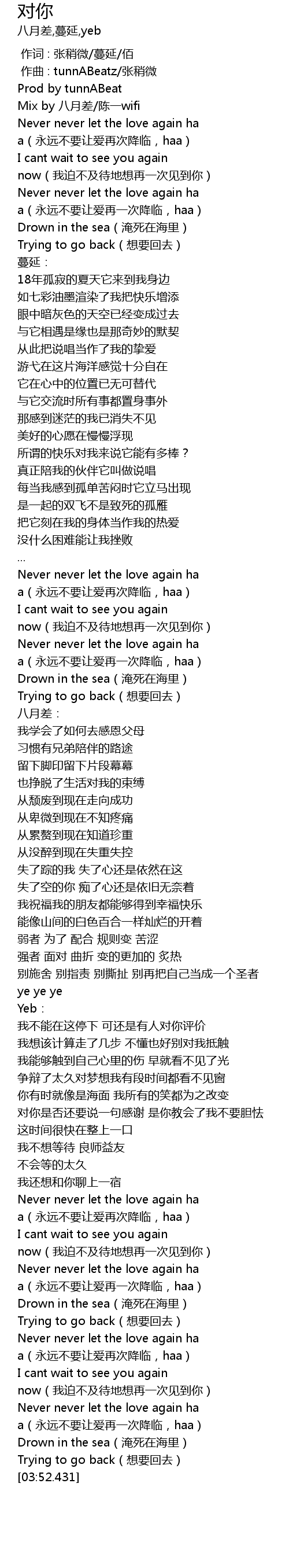 | [03:22.896] | Never never let the love again ha a(永远不要让爱再一次降临,haa) |
