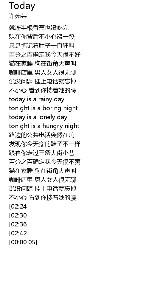 | [02:09] | 猫在家睡 狗在街角大声叫 |