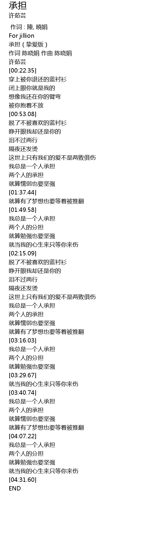 | [02:54.54] | liǎng gè rén de chéng dān |