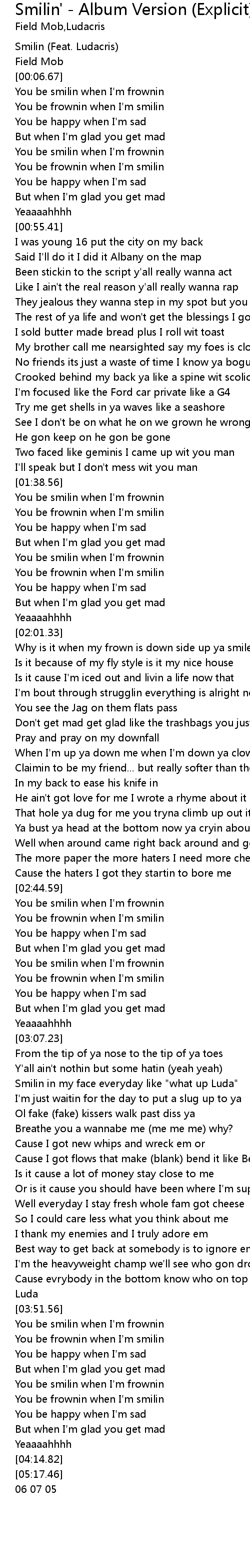 | [00:01.93] | Smilin (Feat. Ludacris) |
