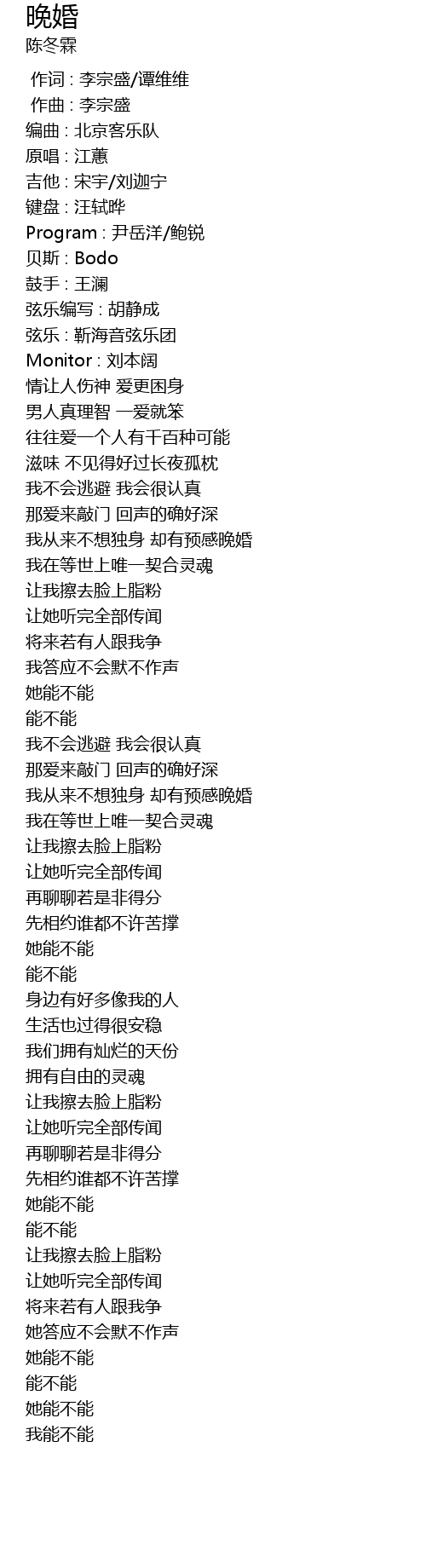 | [01:01.996] | wǒ cóng lái bù xiǎng dú shēn què yǒu yù gǎn wǎn hūn |