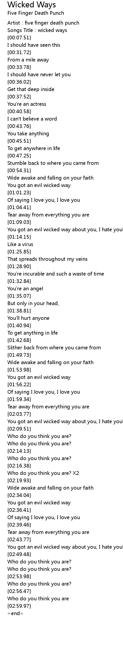 | [00:02.89] | Artist: five finger death punch |