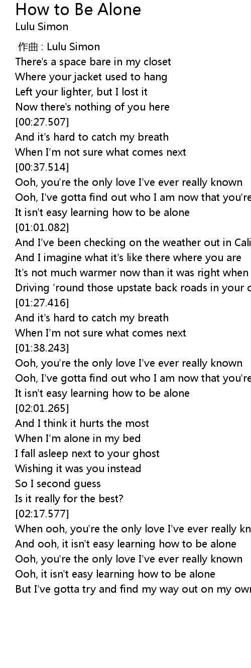 | [00:57.303] | It isn' t easy learning how to be alone |
