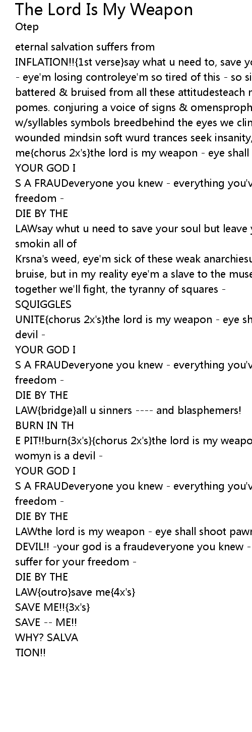 INFLATION!!{1st verse}say what u need to, save your soul, but don't **** with me - eye'm losing controleye'm so tired of this - so sick of u, my tongue is battered & bruised from all these attitudesteach me the magic of your sacred pomes. conjuring a voice of signs & omensprophecies guide the breeze, w/syllables symbols breedbehind the eyes we climb the vine, to sacrifice our wounded mindsin soft wurd trances seek insanity, i can't save u 'cause i hate me{chorus 2x's}the lord is my weapon - eye shall shoot pawns, womyn is a devil - |