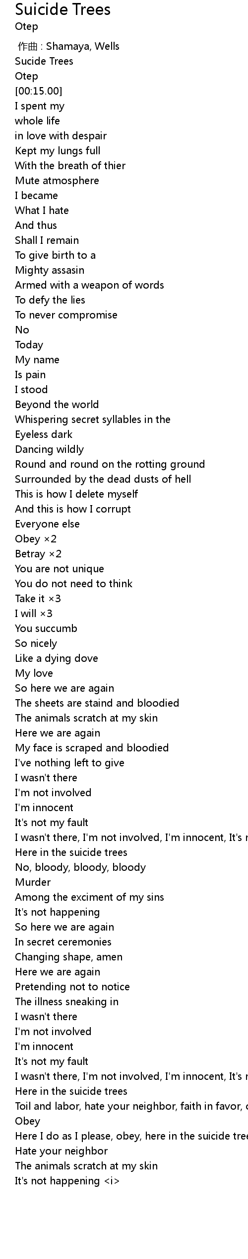 | [05:54.50] | Here I do as I please, obey, here in the suicide trees, obey |