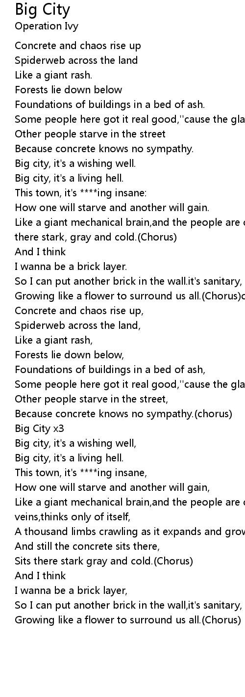 Like a giant mechanical brain,and the people are cells and the streets are sits there stark, gray and cold.(Chorus) |