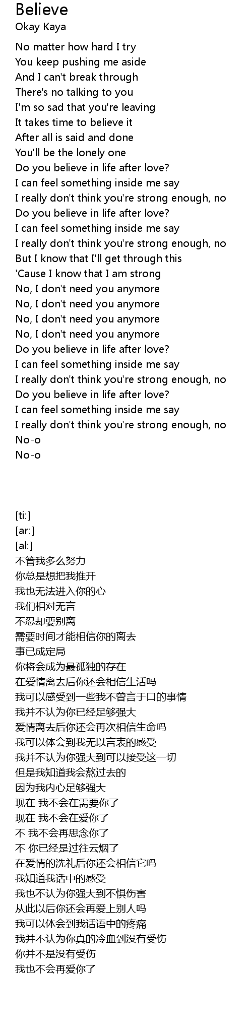 | [00:43.85] | Do you believe in life after love? |