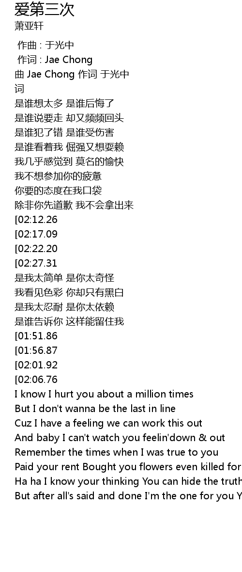 | [03:37.93][02:27.31][01:16.61] | 爱第三次你要更明白 别给我伤害 |