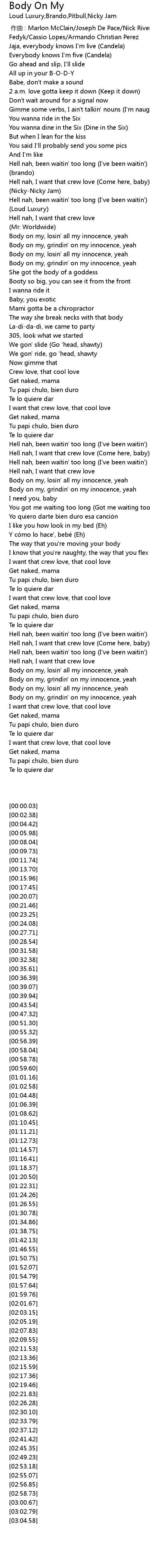 | [01:46.55] | Body on my, grindin' on my innocence, yeah |