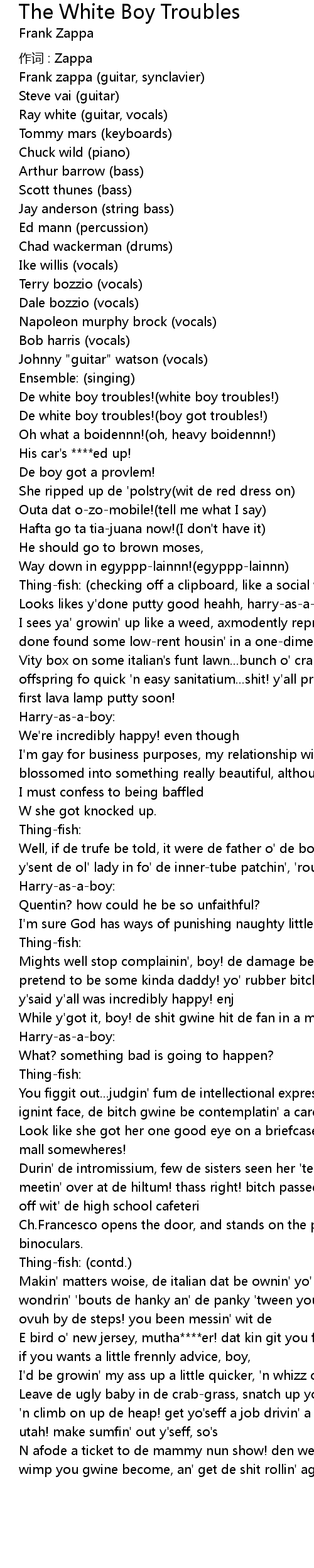 | Makin' matters woise, de italian dat be ownin' yo' nativity bungalow been wondrin' ' bouts de hanky an' de panky ' tween you ' n dem two concrete flamingos ovuh by de steps! you been messin' wit de | |