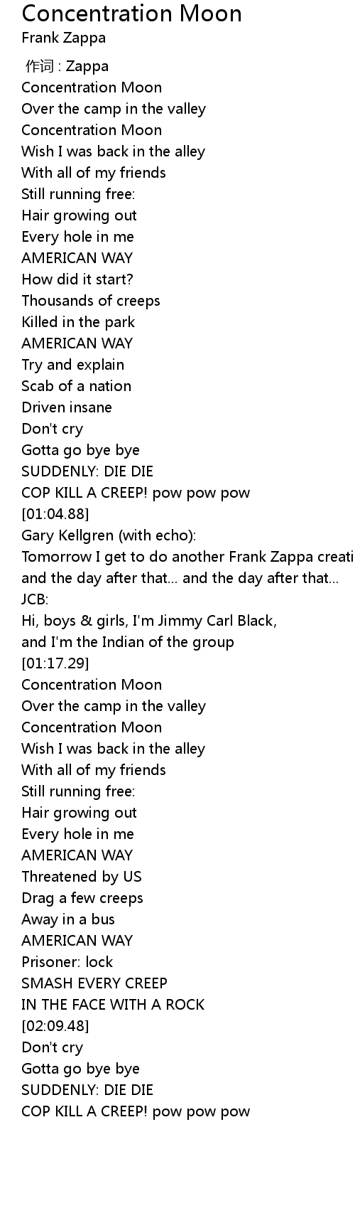 | [01:05.75] | Tomorrow I get to do another Frank Zappa creation... |