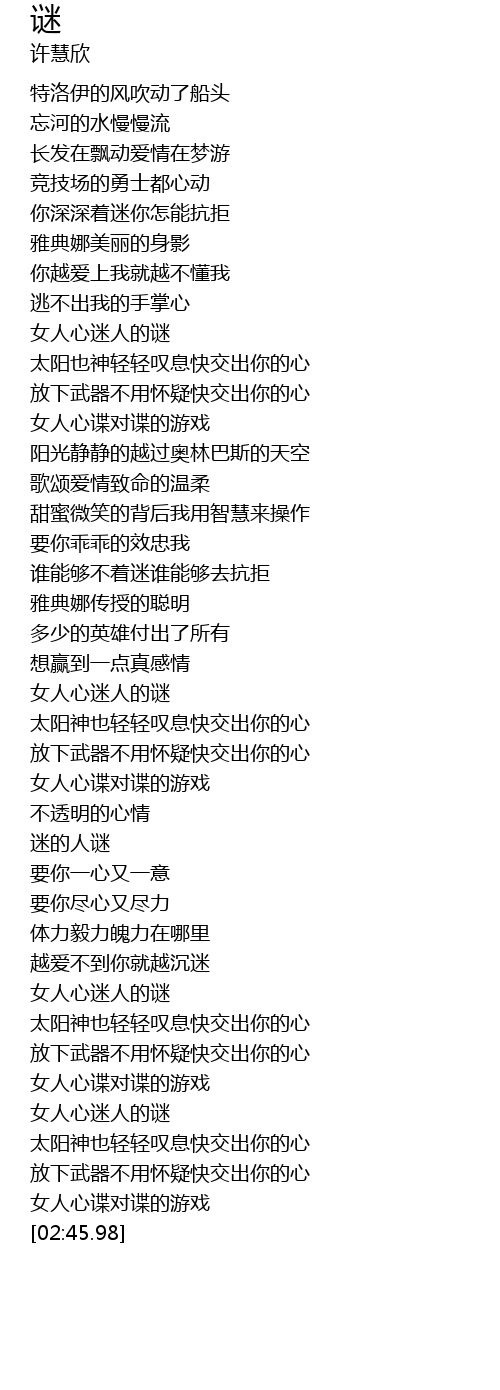 | [02:32.95] | 太阳神也轻轻叹息快交出你的心 |