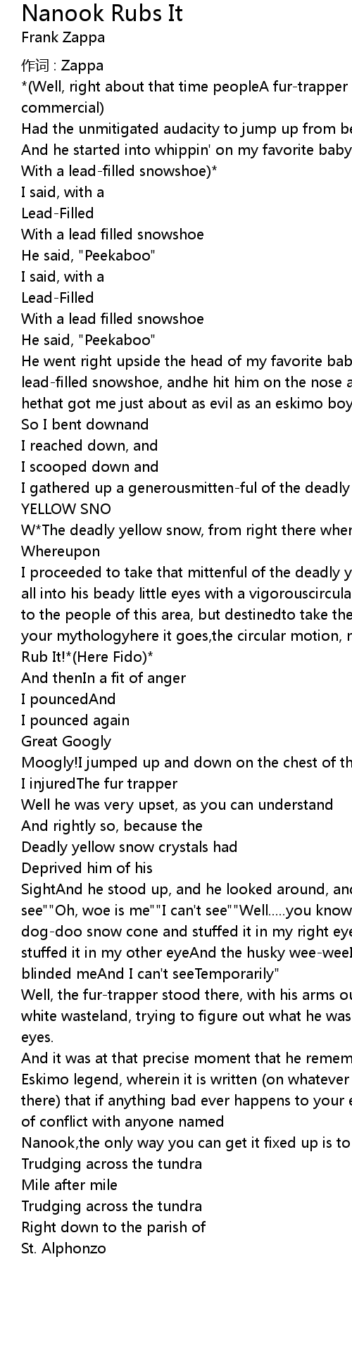 | SightAnd he stood up, and he looked around, and he said"I can't see""I can't see""Oh, woe is me""I can't see""Well.....you knowI can't seeNothin'""He took a dog-doo snow cone and stuffed it in my right eyeHe took a dog-doo snow cone and stuffed it in my other eyeAnd the husky wee-weeI mean the doggie wee-weeHas blinded meAnd I can't seeTemporarily" | |