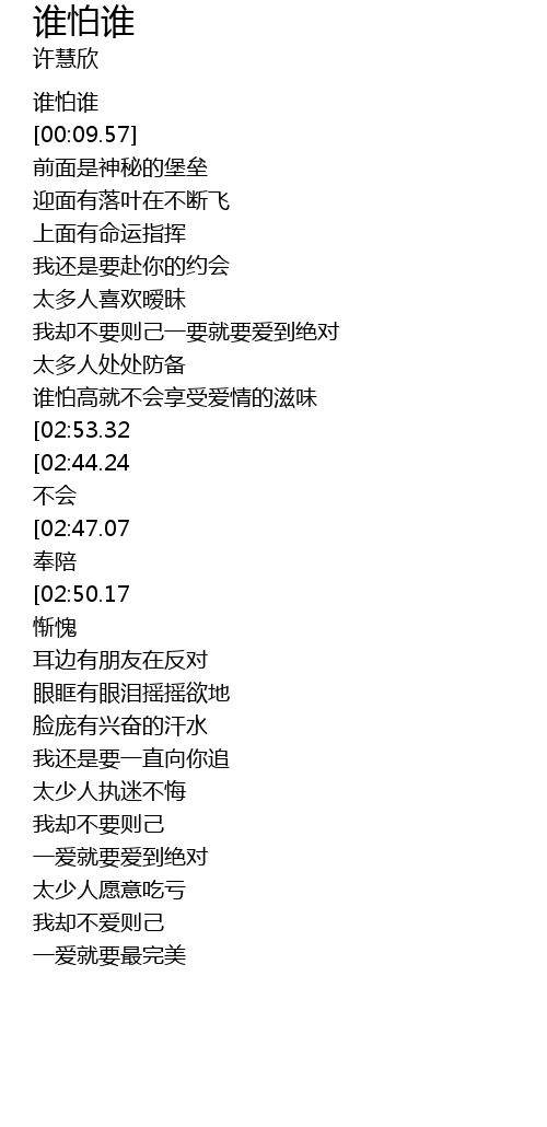 | [02:31.46][02:53.32][02:42.28][01:45.06][01:34.03][00:50.15] | 谁怕谁 no way |