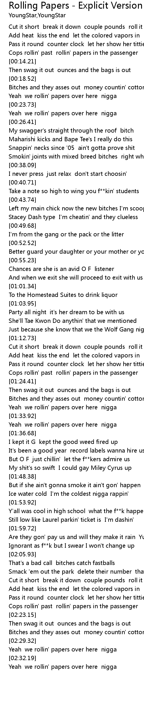 | [00:24.26] | Yeah we rollin' papers over here nigga |