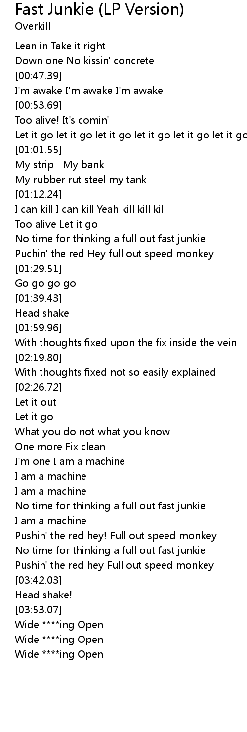 | [01:22.37] | No time for thinking a full out fast junkie |