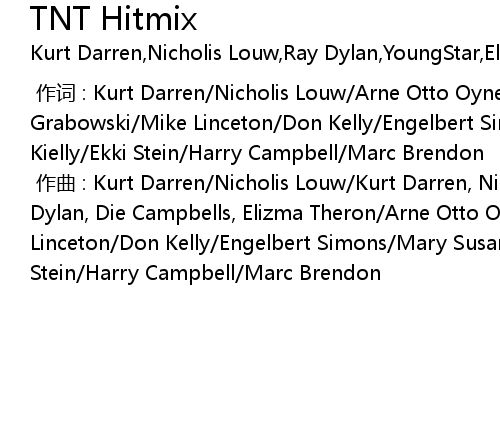 | [00:00.000] | 作曲 : Kurt Darren/Nicholis Louw/Kurt Darren, Nicholis Louw, Ray Dylan, Die Campbells, Elizma Theron/Arne Otto Oynes/Gerd Grabowski/Mike Linceton/Don Kelly/Engelbert Simons/Mary Susan Applegate/Robin Kielly/Ekki Stein/Harry Campbell/Marc Brendon |