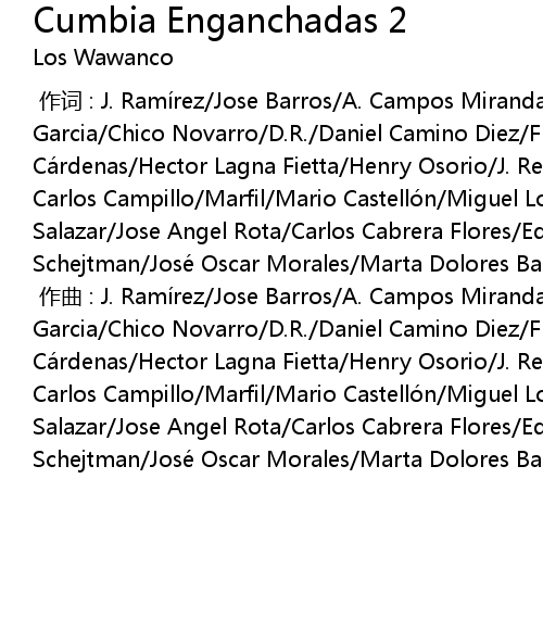 | [00:00.000] | 作曲 : J. Ramírez/Jose Barros/A. Campos Miranda/Angel Luis Garcia/Chico Novarro/D.R./Daniel Camino Diez/Francisco "Pacho" Galán/Felix Cárdenas/Hector Lagna Fietta/Henry Osorio/J. Reyes Cruz/L. E. Martinez/Luis Carlos Campillo/Marfil/Mario Castellón/Miguel Loubet/Herminia V. Cruz/Jorge E. Salazar/Jose Angel Rota/Carlos Cabrera Flores/Edme Cagnoli/Eduardo Schejtman/José Oscar Morales/Marta Dolores Barros/Wilfredo G. Casal |
