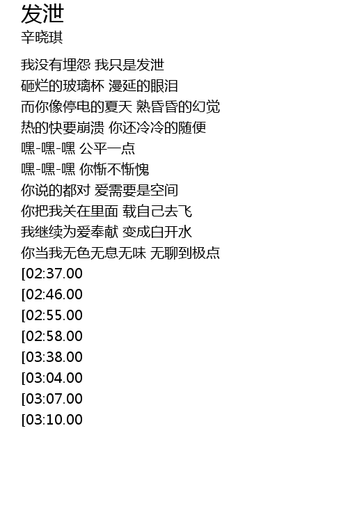 | [03:49.00][03:38.00][03:00.00][02:04.00] | dōu xū yào fā xiè ér yǐ |